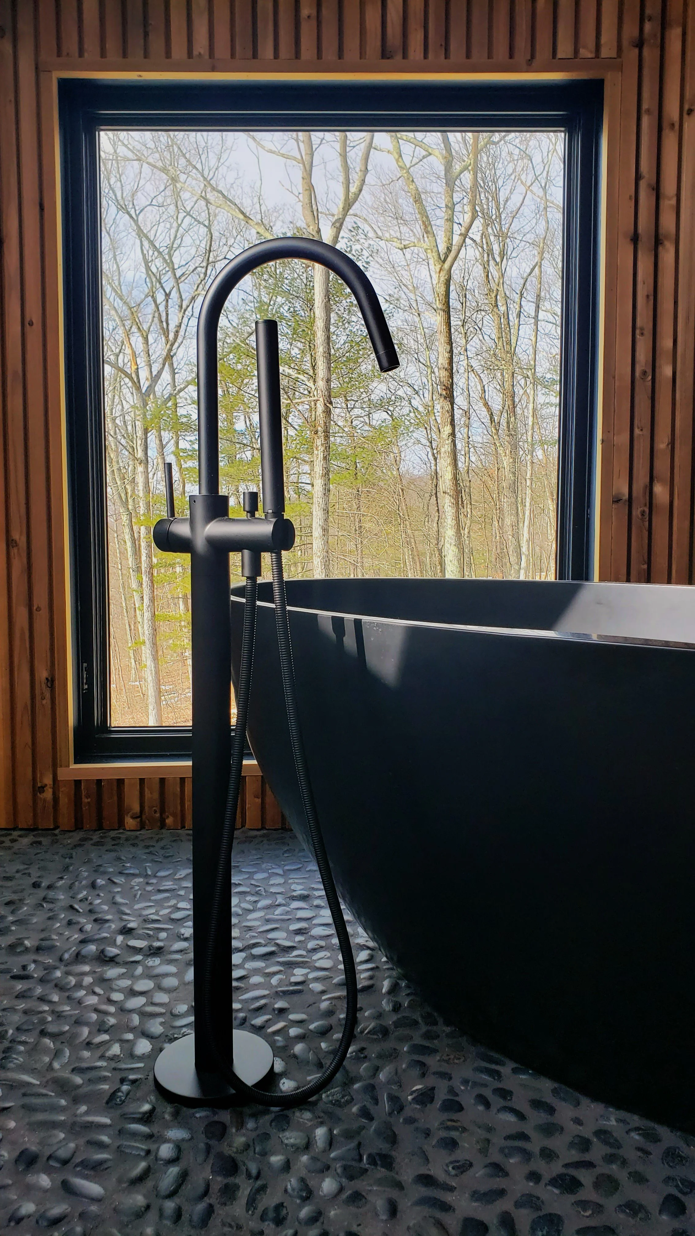 A home renovation in Saugerties, NY. Showing a handcrafted copper outdoor shower, two bathrooms, kitchen, and living room updates.